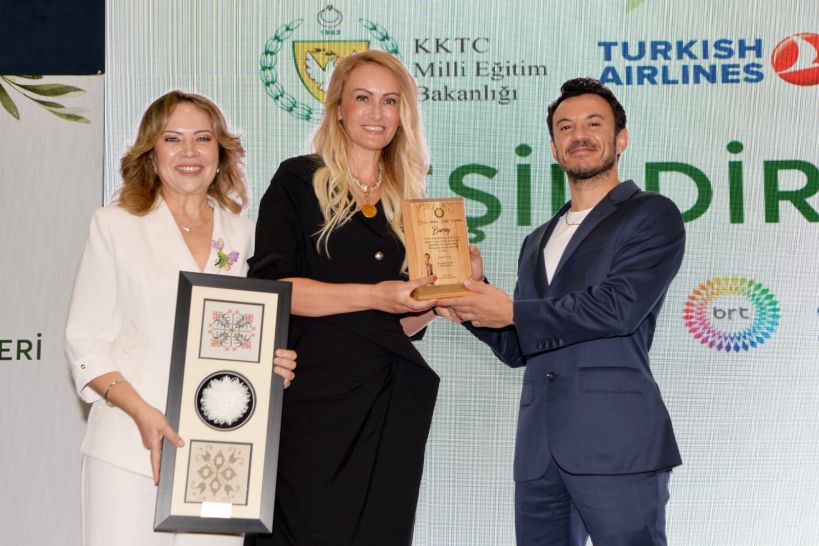Following her speech, First Lady Erhürman presented an award and plaque to Buray, a singer who serves as a Green School Ambassador within the Green Schools Project.