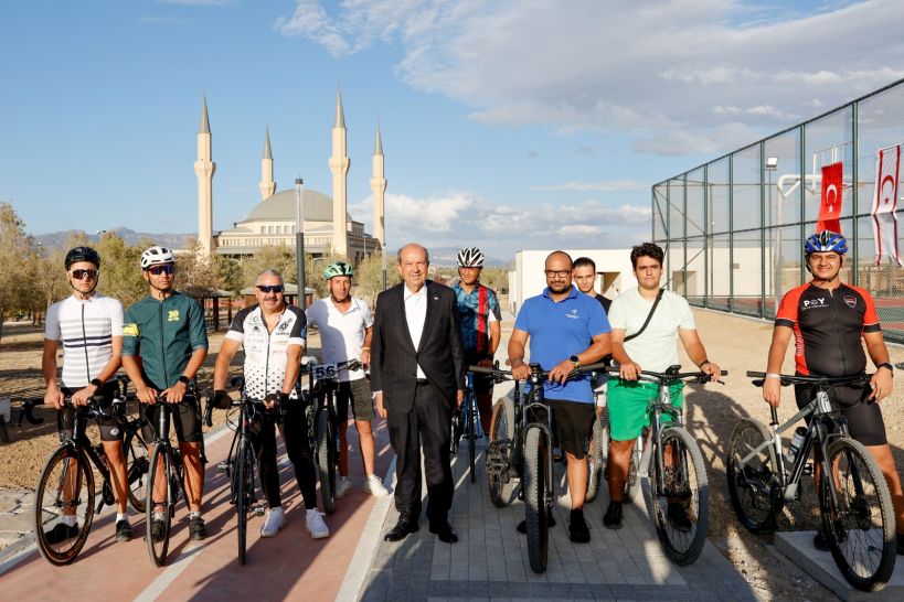 Cumhurbaşkanı Tatar ziyaretinde parktaki rekreasyon ve spor alanlarında bisiklet sürenler, futbol, tenis ve basketbol oynayanlar ile bir araya geldi.