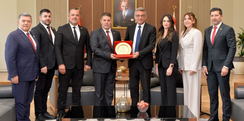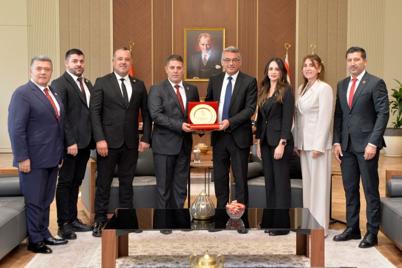 MOK Başkanı Orçun Kamalı, Cumhurbaşkanı görevine seçilen Tufan Erhürman’ı tebrik ederek, ziyaret anısına plaket takdim etti.